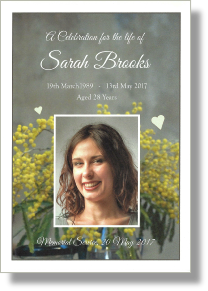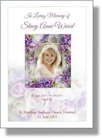 Order of Service booklets are often referred to as Service Sheets or Service Programs. They enable those attending to follow the proceedings and participate where appropriate. Readings, verses, songs/hymns etc are included as well as photographs. The booklets are a special keepsake for family and friends to treasure. I take care of all design, printing & delivery to ensure everything is taken care of with a minimum of fuss. Photographs and images of your choice can be included. Each booklet is given personal attention and each one is unique. Personal verses and poems can be included.